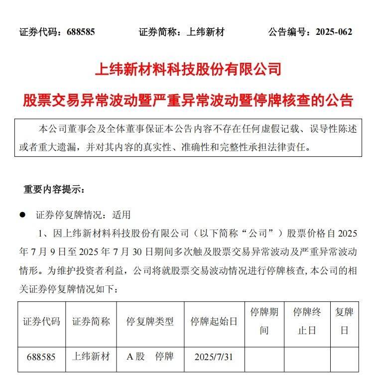 7月30日晚间,上纬新材(688585)披露公告称,公司股票价格自7月9日至7月30日期间多次触及股票交易异常波动及严重异常波动情形,公司将就股票交易波动情况进行停牌核查。公司股票将于7月31日开市起停牌,预计停牌时间不超过3个交易日,自披露核查公告后复牌。