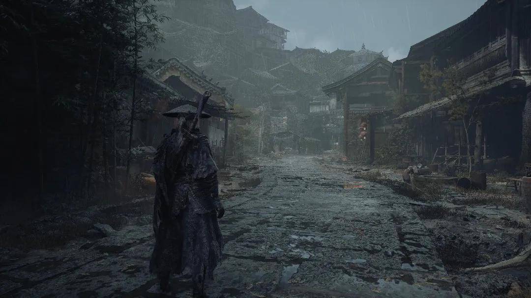 这也是《影之刃零》首次实装光追亮相,而且内容也和上次试玩不同,提供了全新的关卡 “庞镇”。镇子里大面积呈现水面、山体与榫卯结构的木质建筑;在体积雾和光追的共同作用下,PC 端的静态画面呈现出近似水墨的氤氲气氛,十分有层次。