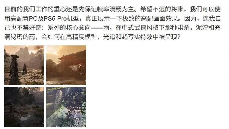 在7月底的《影之刃零》的那场首钢大型线下试玩活动举办前,制作人梁其伟发过一条长微博,解释说这次试玩是在“中等”画质下运行的,因为要在“苛刻的PS5硬件条件下进行开发”,以保证在普通硬件上的优化水平。