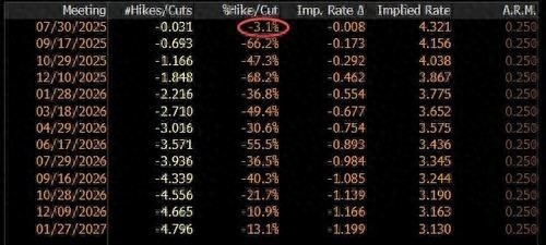 目前,外界普遍预计,美联储在7月29日至30日的会议结束时,美联储政策制定者将连续第五次会议维持利率目标区间在4.25%-4.5%不变。利率市场的定价显示,美联储在今晚议息会议上降息的可能性仅有可怜的3%!