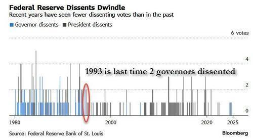 如下图所示,上一次有多名美联储理事在一场会议上同时投下反对票已经要追溯到1993年了——自那以来,美联储总共举行了259场政策会议。在此期间,虽然美联储也曾出现过单次会议上同时出现两三张反对票的情况,但投下反对票的多数是地区联储主席(在影响力方面要略显理事一筹)。