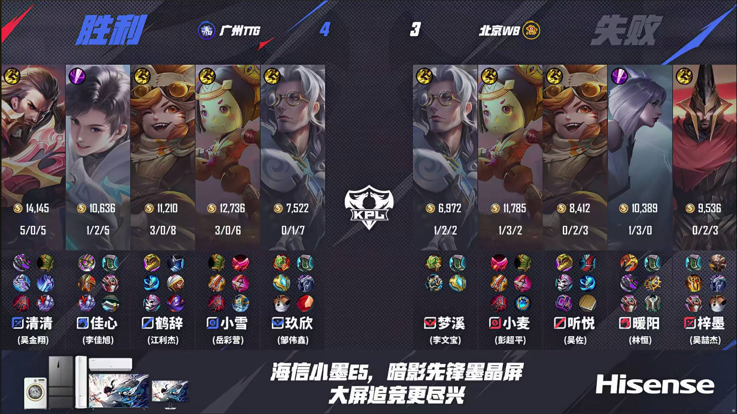 第四局就不得不说清清的关羽,真的太绝了。最精彩的就是这波,看着在下路清线呢,从自家野区绕了个大圈过来,海月帮忙开了视野。清清不知不觉中溜进了WB红区,直接击杀了干将,听悦根本想不到清清能从这个位置绕过来。中路的这一波也是清清的关羽绕后接冰甲控到三个,张良马上过来闪按,但自己也吃到了冰甲的控制,清清又劈出一刀,佳心的铠追着砍死了小麦,小雪一枪点死张良,再回头处理梓墨的蒙恬。可以说这两波节奏基本就是奠定胜局了,清清